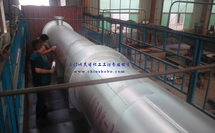 操作人員在換熱器設(shè)備上打上三門峽昊博化工工程有限公司標(biāo)示和電話0398-2918156