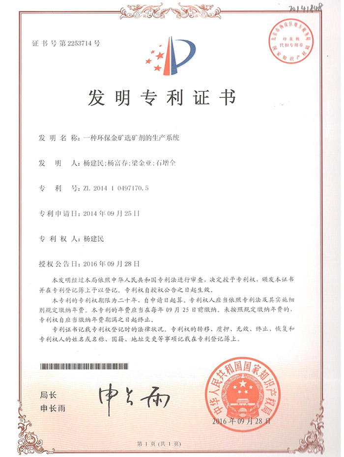 熱烈祝賀我公司又取得一項(xiàng)專(zhuān)利《一種環(huán)保金礦選礦劑的生產(chǎn)系統(tǒng)》